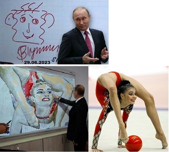 А вот 30 мая 2023, Глава государства посетил выставку «Развитие креативной экономики в России», и его внимание привлекла «картина» с «художественным изображением» «гимнастки», так похожей на Алину Кабаеву. Путин тут же подошел к этой картине и оставил на ней свой автограф... Многие шутники, по этому поводу, вспомнили миссис Мертон (*ведущая комедийного ток-шоу The Mrs Merton Show, выходившего с 1994 по 1998 год на британском телевидении), которая вполне могла бы задать нашему президенту такой в