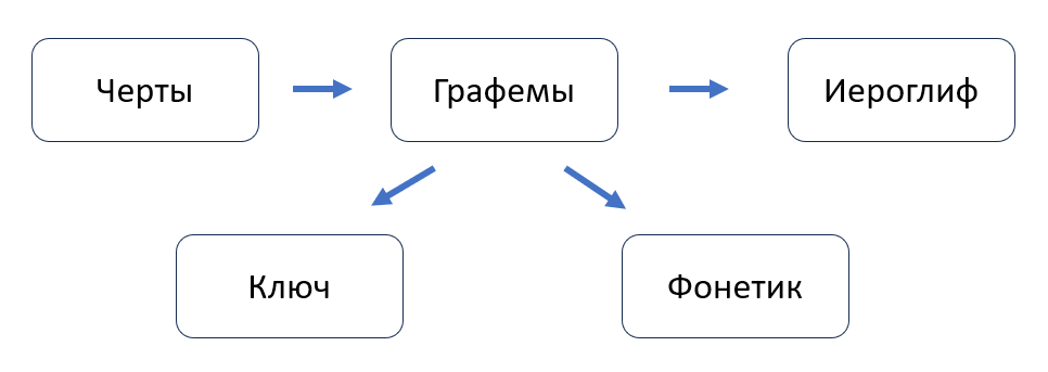 她 (она) здесь 女 – это графема, которая является частью иероглифа. Если у нас есть ключ, то мы сможет открыть дверь и узнать смысл иероглифа. Например: 木 (дерево), 氵(вода). Увидев иероглиф 森, мы можем догадаться, что речь идёт о древесине или о месте, где много деревьев, а 海 имеет отношение к воде. 森林 – это лес, а 海 – это море. Фонетик (от греч. phonema — голос, звук) подсказывает нам звучание иероглифа. Где здесь фонетик? 工 gōng - 红 hóng; 各 gè - 客 kè 洋: 9 черт, ключ - 氵, фонетик - 羊, пиньинь - yáng, shuǐч