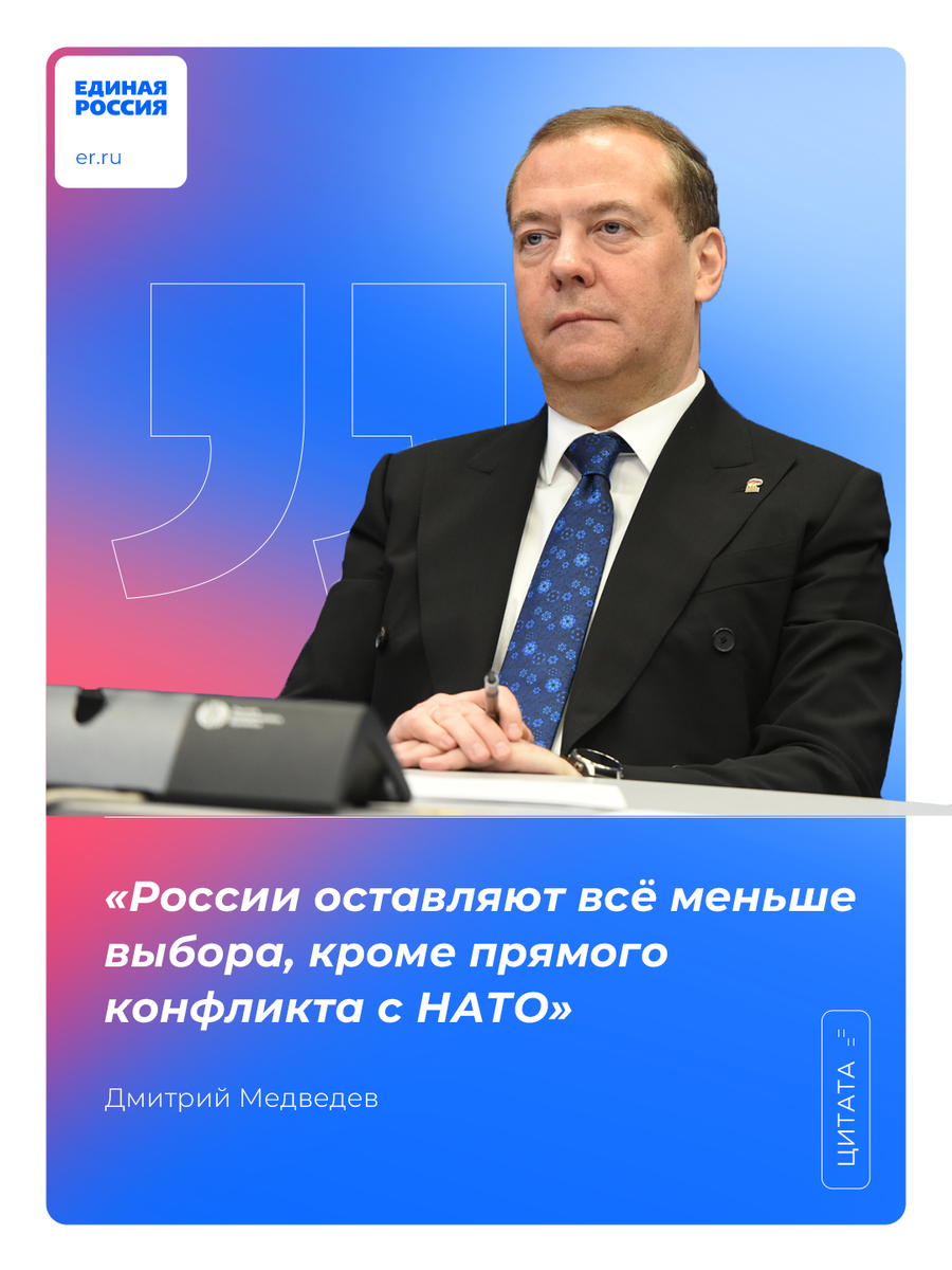Похоже, что России оставляют всё меньше выбора, кроме прямого конфликта с НАТО на земле, который превратился в открыто фашистский блок типа гитлеровской оси, хотя и большего размера. Мы готовы, хотя результат будет достигнут с гораздо большими издержками для человечества, чем в 1945-м… », - написал Дмитрий Медведев в своем телеграм-каналеъ