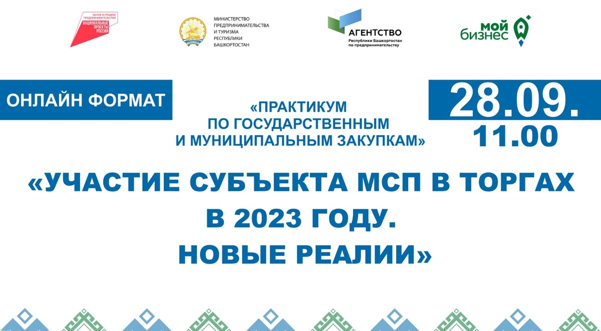 28 сентября состоится мастер-класс «Участие субъекта МСП в торгах в 2023 году. Новые реалии». В рамках серии мастер-классов «Практикум по муниципальным и государственным закупкам» он пройдет в онлайн – формате. К участию приглашают заказчиков и участников процедур закупок, которые начинают работу в соответствии с законом о контрактной системе. Спикер: Николай Аноцкий, региональный представитель ООО РТС-тендер в Республике Башкортостан, эксперт практик в области государственных закупок со стажем работы более 10 лет, с опытом со стороны заказчика и поставщика. В программе мастер-класса: - Единая информационная система (ЕИС): основная и мобильная версия, открытая часть, поиск закупок; - Настройка рабочего места и получение электронной подписи (ЭП); - Обзор федеральных электронных торговых площадок; - Анализ извещения, подготовка и подача заявок на участие, торговая сессия; - Заключение контракта и электронная приемка. Регистрация по ссылке: https://clck.ru/35okm7 Начало в 11.00 ч. Организ