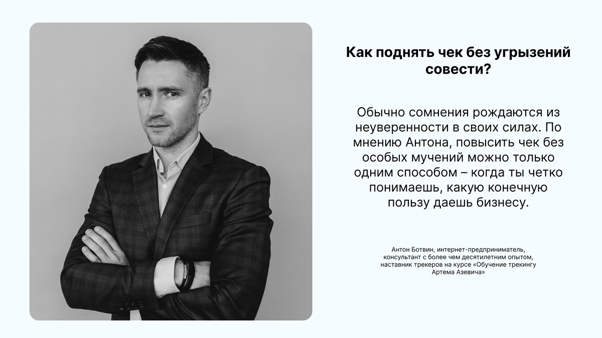 За сколько продать свои знания? Желательно так, чтобы не продешевить, но и не испытывать муки совести за высокий чек. Этот вопрос остро стоит не только перед новичками, но и перед многими крутыми экспертами. Рассмотрим на примере трекинга – абсолютно универсальной методики, которая позволяет масштабировать любые бизнесы, вне зависимости от их ниши и размера, за счет внедрения конкретных инструментов и апгрейда мышления. Чем трекинг отличается от консалтинга, можно почитать здесь. Профессия пока еще новая, поэтому вопрос, сколько просить денег у потенциального клиента за свои услуги, особенно актуален. Да и в силу своей универсальности, методология может быть применена как для усиления работы конкретного отдела, так и охватить весь бизнес в целом – а это уже разные вещи. В общем, вводных много. Что делать, как определить стоимость своих навыков? Отталкиваемся от своего заработка Один из рецептов есть у Антона Ботвина, интернет-предпринимателя, консультанта с более чем десятилетним опыто