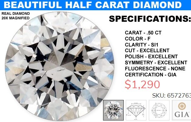 До тех пор, пока на камне нет огромных чёрных угольных пятен , с ним всё будет в порядке. Как правило, разумно придерживаться SI1 (из-за внешнего вида и доступности по цене)… Выбрав все эти атрибуты, вы получите точно такой же бриллиант, как этот: В-четвёртых, на него вы не потратите много денег - полукаратники в несколько раз дешевле, чем б
