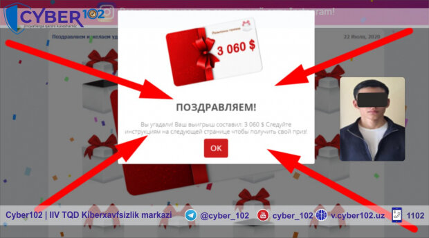 В органы внутренних дел обратился 20-летний житель города Наманган и сообщил, что с его банковской пластиковой карты исчезли денежные средства, в размере 9 544 000 сум. Оказалось, с потерпевшим в мессенджере "Telegram" связался неизвестный гражданин и скинул ссылку на игру, в которой возможно выиграть большой денежный приз. Перейдя по этой ссылке, потерпевший ввёл свои реквизиты банковской пластиковой карты и чуть позже с неё исчезли денежные средства.