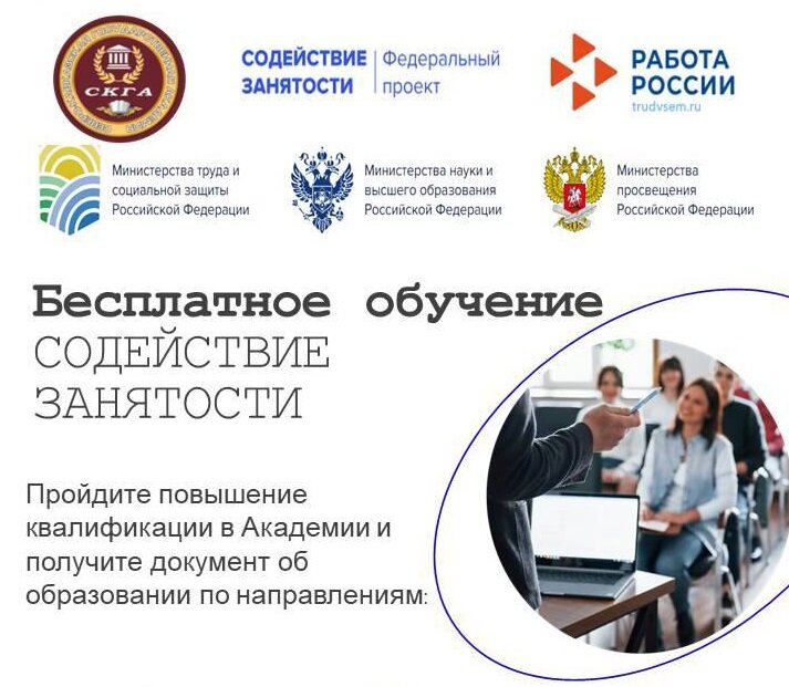 Институт открытого образования Северо-Кавказского государственной академии открывает набор на бесплатное повышение квалификации в рамках федерального проекта «СОДЕЙСТВИЕ ЗАНЯТОСТИ». На базе СКГА граждане смогут пройти обучение по следующим направлениям: