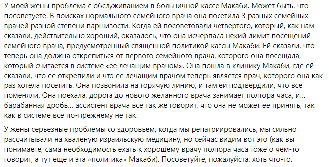 У каждой из них есть свои плюсы и свои минусы, как это обычно и бывает. Например, Клалит — самая большая касса в стране и есть в каждой деревушке. Можно записаться к любому врачу, вне зависимости от места проживания. То есть в какой бы далекий уголок страны вы не забрались, врачи Клалит окажут вам помощь. Но русскоязычных спецов здесь маловато. В больничной кассе Маккаби на экстренном номере почти всегда говорят на русском и есть очень удобное приложение для смартфона, где в любой момент можно посмотреть карту и записаться к врачу. Кстати, поэтому в основном русские репатрианты выбирают именно ее.