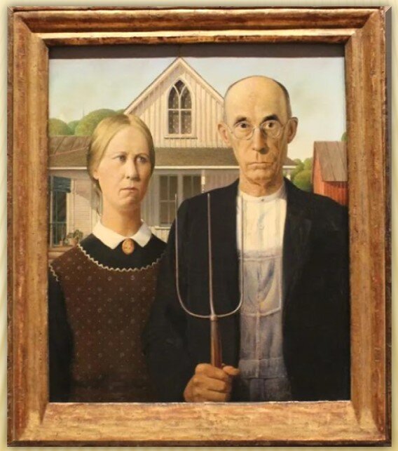 "Американская готика", написанная в 1930 году и находящаяся в собрании Художественного института в Чикаго, осталась самым известным произведением Гранта Вуда. Картина "Американская готика" так полно выразила характер дарования художника, его эстетические принципы, систему идей, что сам Вуд, ее автор, вошел в историю искусства США как автор одного произведения. Послание, запечатленное в картине: На фоне великой депрессии, последовавшей за мировым экономическим кризисом 1929 - 1933 годов, в атмосфере социальной нестабильности и падения общественной морали "Американская готика" утверждала незыблемость извечных ценностей: Композиционно полотно напоминает американскую фотографию конца XIX века. Пуританская сдержанность изображенных людей во многом соответствует реализму, характерному для европейского движения 1920-х годов - " Новая вещественность". Кроме того, картина обнаруживает параллели с "Новым видением"-реалистическим направлением в американской художественной фотографии 1920-1930-х г