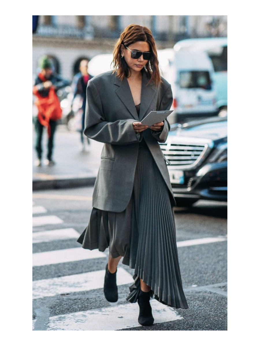 Список главных мастхэвов осени точно не будет полным без юбки миди. Мы не отказываемся от женственных силуэтов в холодное время, но выбираем более подходящие для наступившего сезона материалы: например, искусственную кожу и деним. Днём стилизуем юбку с мягким и объёмным трикотажем, а для вечерних образов выбираем двубортный жакет прямого кроя. Плиссированная юбка