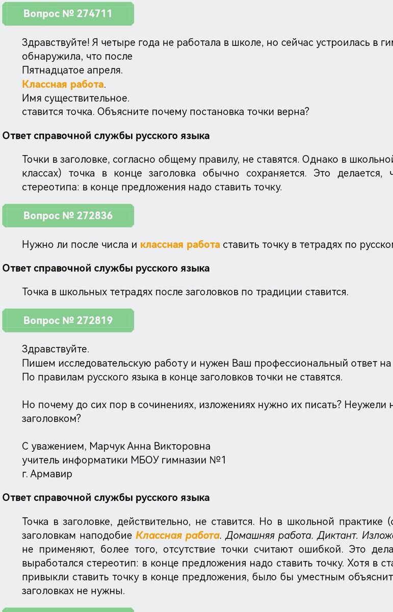 На днях пишет мне ученица. Поступила она после 9 класса в медицинский колледж. Там готовят зубных техников. Проблема возникла на уроке русского языка, когда она и другие ученики (чуть ли не все) не поставили точку после слова "диктант". Споры об этой точке (и после даты, и после "классной работы") идут уже очень давно. В бытность, когда мы ещё проводили педсоветы по преемственности между начальной и средней школой, этот вопрос звучал постоянно (как и вопрос, какой частью слова считать -ТЬ в неопределённой форме глагола). Вот, честно сказать, не считаю этот вопрос "с точкой" таким уж важным, тем более что и Грамота.ру. не даёт однозначного ответа Не вижу я проблемы здесь и никогда не фиксировала внимание на этом. Неужели нет других проблем в языке? А у ученицы в колледже кончилось тем, что учительница отчитала их и поставила всем 2. Из-за этой пресловутой точки. Правда, позже смилостивилась и велела сделать работу над ошибками. НАД ЧЕМ ЗДЕСЬ РАБОТАТЬ? Но. Вот про эту точку я не пере