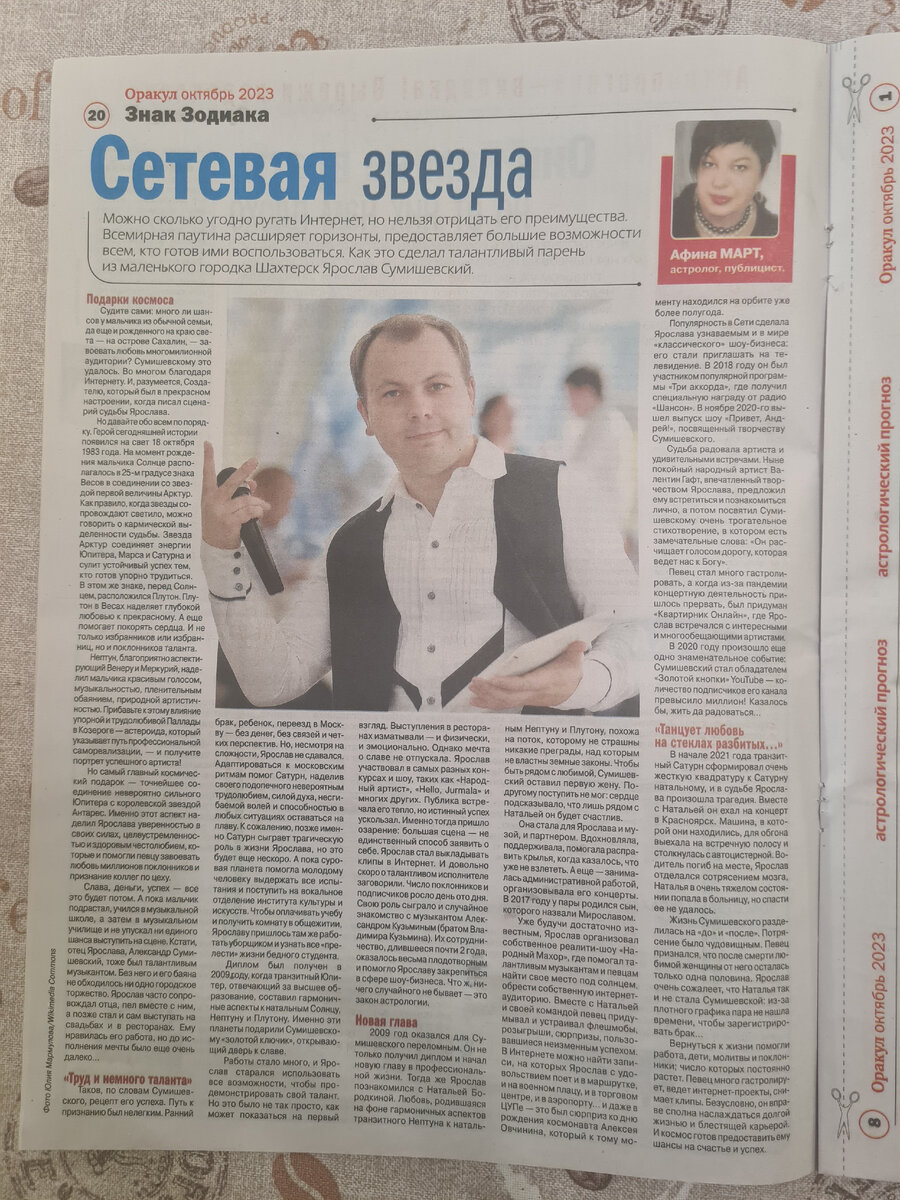 Какие восхитительные нынче погоды стоят. Но, осень меня порадовала не только теплом и солнечным светом. Купила сегодня газету Оракул, а там на 20 стр. моя очередная публикация, об Ярославе Сумишевском. Судьба человека через призму звёзд. Невероятные ощущения радости и восторга. А, вы читаете газету Оракул?