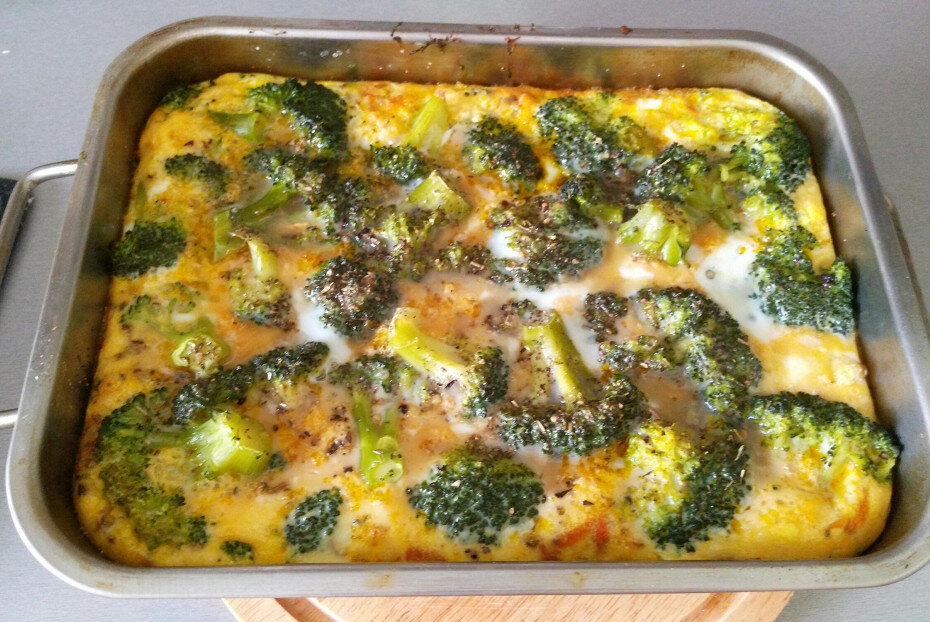 ИНСТРУКЦИЯ ПРИГОТОВЛЕНИЯ 1.Брокколи вымыть, разделить на соцветия. 2.Лук и морковь очистить, морковь натереть на крупной терке, лук мелко нарезать. 3.В кипящую подсоленную воду опустить брокколи, довести до кипения и варить 3–5 минут. Брокколи не должна потерять хрусткость. 4.Тем временем, разогреть в сковороде оливковое масло и обжарить лук и морковь. 5.В огнеупорную форму выложить обжаренные лук и морковь, сверху — соцветия брокколи, посолить, поперчить, добавить травы. 6.Яйца немного взбить, залить смесью брокколи. 7.В предварительно разогретую до 200 градусов духовку поставить брокколи. Запекать примерно 15 минут. Любите читать Дзен «Еды»? Расскажите свое мнение о материале в комментариях и ставьте свои лайки!