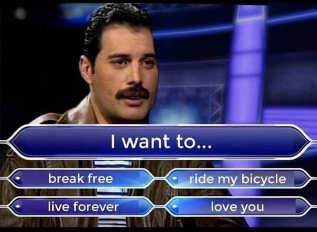 Концепт: музыкальный мем! 😁: cначала воспринимается как картинка, о если обладать культурным кодом (привет поколениям '80/90) - то картинка внезапно начинает звучать 👁 - причём, в идеале, в 4-х разных вариантах (= 4 разные композиции). Ну, что же хочет старый добрый Freddie? 😉, при активной поддержке своей группы Queen? Ключи 😁🗝 - подвох в том, что верны все 4 варианта, а именно: 1. Композиция "I want to break free". Вечная классика 😇 2. Композиция "Who wants to live forever"? - в ней строчки "live forever" - глубокая философская вещь. 3. Композиция "Bicycle RACE", шутливая и бесшабашная, строчки "I want to ride my bicycle"- именно оттуда🙂 4 . Композиция "I was born to love you", стремительная и жизнелюбивая, повторяющийся на фоне рефрен "love you"- именно оттуда🙂