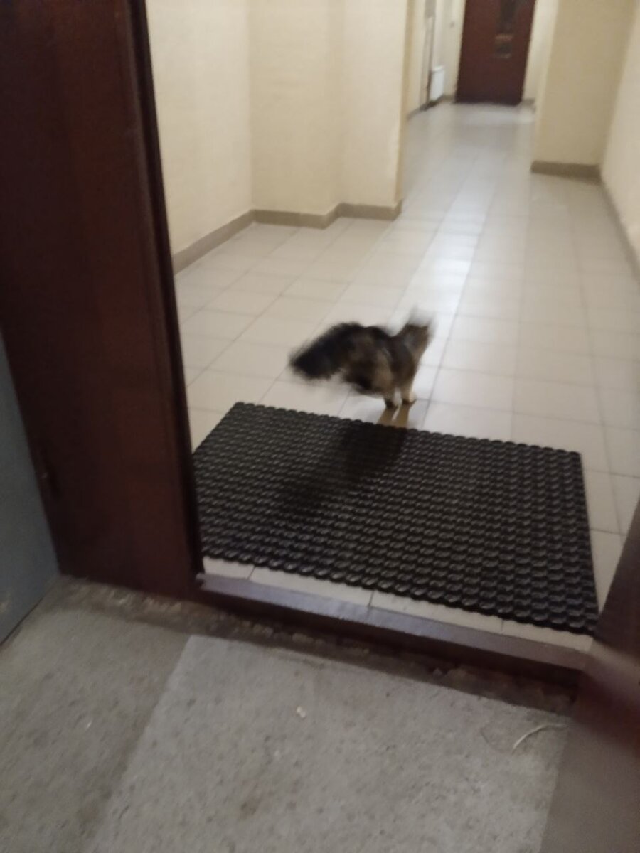 В понедельник, возвращаясь с тренировки, мы с мужем у парадной заметили шикарное котэ. Буду называть в среднем роде, так как мы в итоге и не узнали, кошка это или кот. Очень чистое и красивое животное и шикарным хвостом как у белки. Большое. У парадной. Около полуночи.🤦♀️ Я не смогла не попытаться вынести пушистику корма, но от корма оно отказалось! Немного шуганулось от меня и проскакало в парадную. И за мной в лифт. Вот такая котокрасота. Из лифта тоже выскочило за мной, но побежало к совсем другой квартире, где и зашхерилось под детскими колясками. Я успела сделать несколько фото и погладить, но гладиться оно не хотело. На руки взять тоже не удалость. Я только почувствовала, что шерсть очень чистенькая, лапы белые-белые, совсем не бродячее животное. Домой я пригласить его не могла, потому что (не делайте так!) мы просрочили вакцинацию Шико.😕 Учитывая обстоятельства, я уже купила таблеткодавалку, ведь перед вакцинацией надо проводить дегильминтизацию, и мы с мужем морально готовим