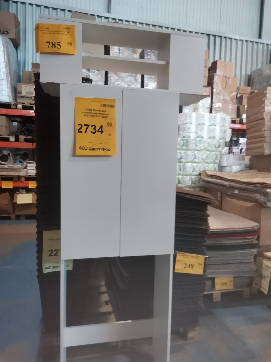 Сам шкаф сделан с расчетом на то, что в нижней части будет располагаться стиральная машина, а сверху мы можем поместить уже бытовую химию или что-то еще. В магазине мебель показана в собранном виде, можно заранее присмотреться и оценить ее качество. Скажу так: даже самим сотрудникам было интересно, стояли рядышком и обсуждали, да и без того их неплохо покупают, некоторые уже специально ищут их в ассортименте своего города.