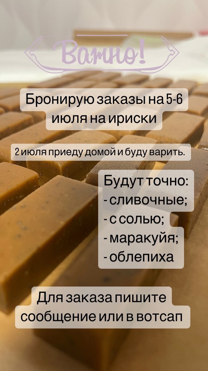 Заказы на ириски бронирую на 5-6 июля.