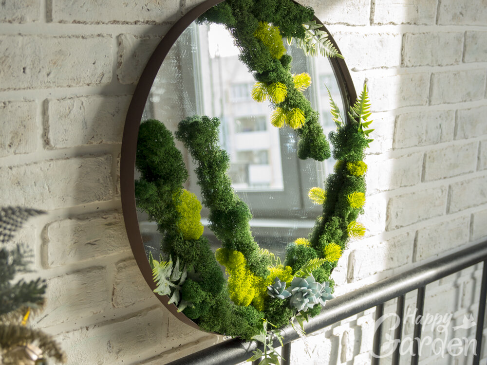 И в итоге стало понятно, что мох пойдет по диагонали, чтобы скрыть пятна и царапины на самой старой зеркальной поверхности. А суккуленты останутся в нижней части