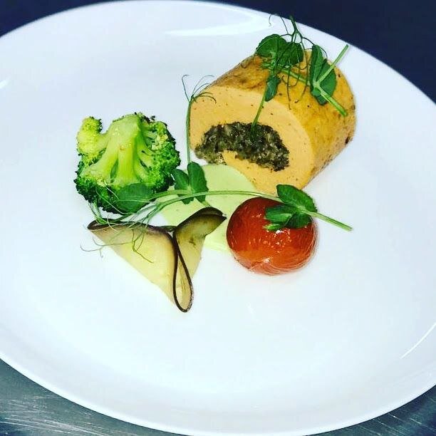 Куриный рулет имеет консистенцию мусса. Начинка из обжаренных грибов, измельченных на блендере. Приготовлен способом су-вид. Су-вид (также су-вид, от фр. sous-vide, «под вакуумом») — метод приготовления пищи, при котором мясо или овощи помещаются в пластиковый пакет с откачанным воздухом и медленно готовятся при сравнительно низкой и точно контролируемой температуре, обычно в водяной бане. В гарнир входит: Соус на основе сливок и свежей зелени.