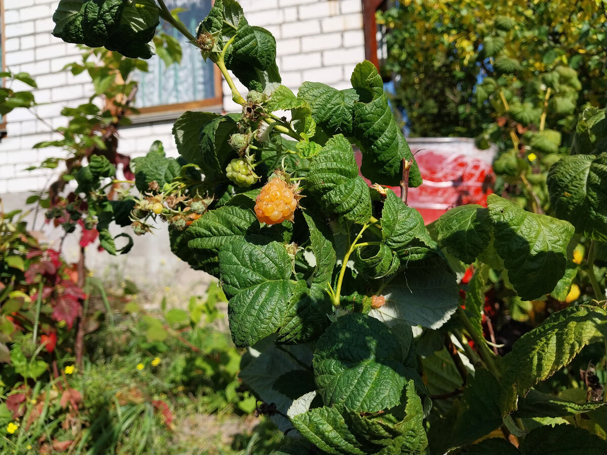 Наконец-то у меня появилось время заняться кустами малины. Тут я обнаружил, что желтая малина дала маленький, но урожай! Мелочь, конечно, 5 ягод, но всё равно очень приятно!