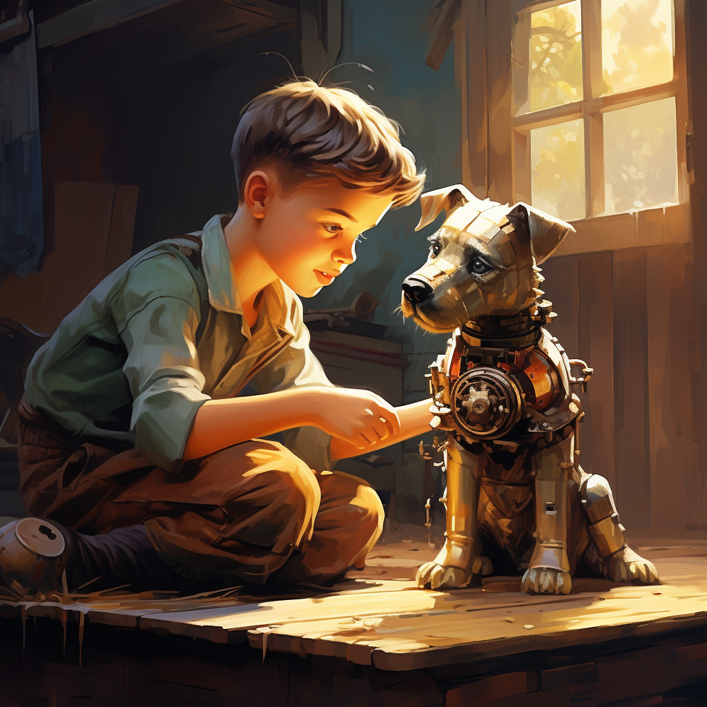 Однажды вечером, когда мальчик пошел гулять со своим другом по улицам города, он увидел странную собаку. Она была необычной формы и имела металлическое тело. Но самое удивительное было то, что у нее была сломана лапа. Мальчик был очень любознательным и решил подойти к собаке, чтобы рассмотреть ее поближе. Он заметил, что это был робот-собака, который, видимо, был потерян или выброшен своими хозяевами. Мальчик почувствовал сильное сочувствие к этой собаке-роботу и решил помочь ей. Он взял собаку домой и начал разбирать ее лапу. Он был уверен, что сможет починить ее. Мальчик провел много часов, чтобы разобрать и починить лапу робота-собаки. Он использовал все свои знания в области робототехники и электроники, чтобы сделать ее лучше, чем была до того. Когда мальчик закончил работу, он включил робота-собаку и она начала работать. Она была так благодарна мальчику, что начала лизать его руку. Мальчик улыбнулся и понял, что он сделал что-то хорошее. С тех пор мальчик стал лучшим другом