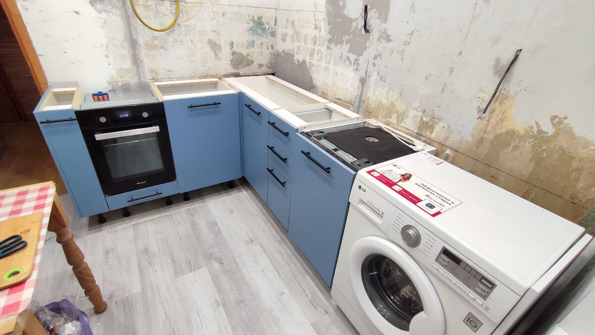 Начало ремонта тут Я сегодня коротко, ибо очень устала и спать хочется. Но не могу не похвастаться. Мы сегодня собрали нижний ярус кухни!!!👍 Встроили технику. Но пока без столешницы. Но уже начинает вырисовываться наша новая замечательная кухня во всей ее красе! Завтра продолжим. Как же мне нравится цвет нашей новой мебели!!! Небесно-голубой прекрасен! Обеденный стол пока старый, но скоро будет новый. Продолжение следует ...
