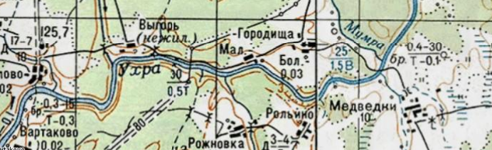 В районе деревни Городища в Ухру впадает речка Мо́рва. На современных картах она может быть обозначена как Мумра или даже Мымра.