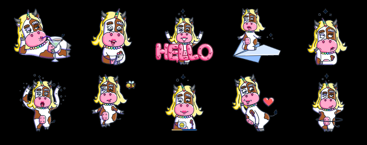 Разрабатываем и делаем анимацию персонажа для стикеров Telegram. Прототипирование персонажа для стикеров по желанию заказчика. Отрисовка в Procreate и анимирование с помощью After Effects. ОПИСАНИЕ Нами был разработан персонаж для стикеров Telegram. По желанию заказчика персонаж должен представлять собой мультяшную коровку, выполняющую разные интересные и игривые действия.