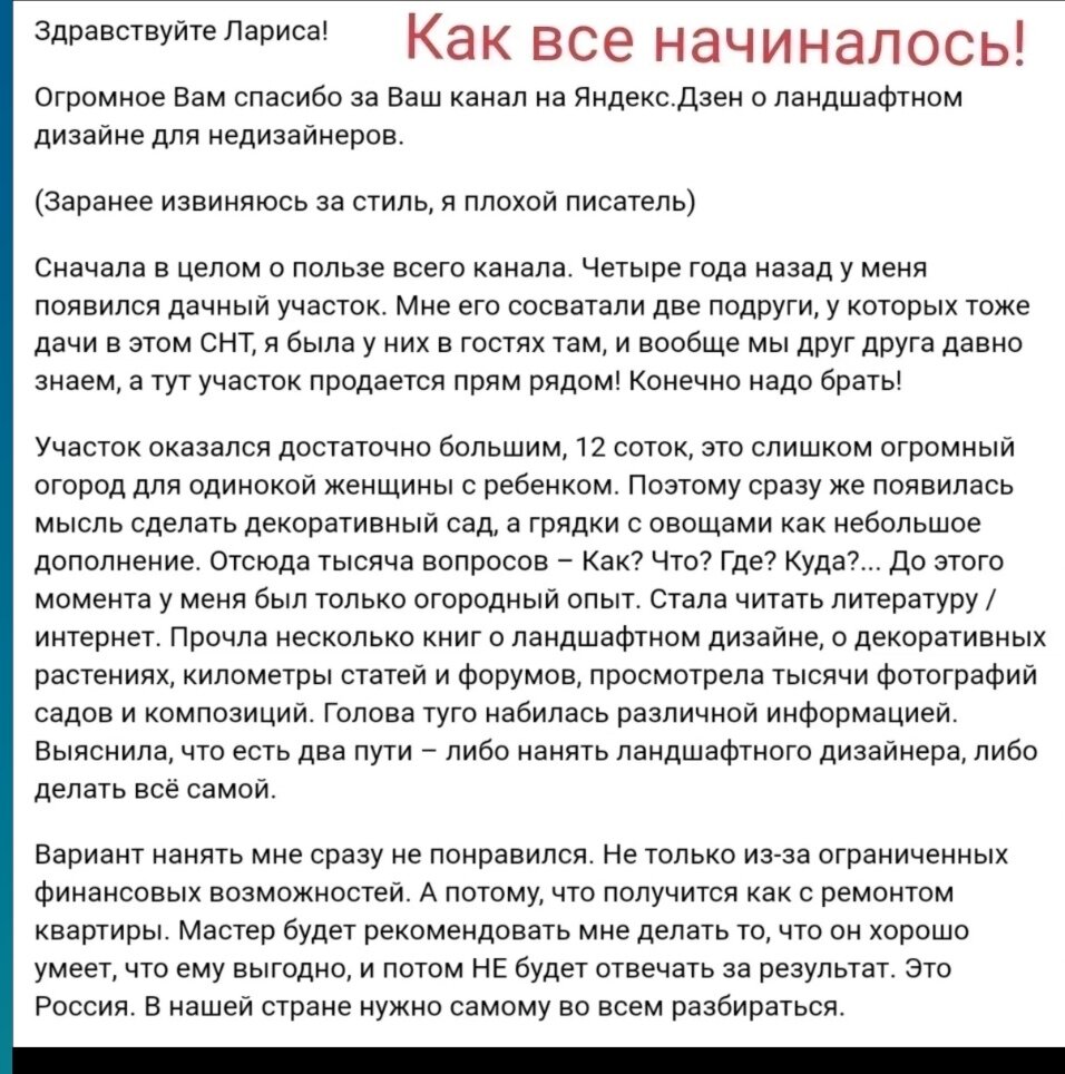 Материалы на канале я делю на информационные и практические. Информационные продукты Контент. Бесценная информация о том, как планировать самостоятельно, создавать прекрасные цветники и миксбордеры для вашего милого сада 🤗 🔷 Дзен канал "Real сад" Более 300 невероятно полезных статей. Из них 16 статей о разных газонах и лужайках 8 о планировании дорожек 16 о создании цветников 23 о бюджете сада. 🔷 Телеграм канал "Ландшафтный дизайн для не-дизайнеров" Очень уютное пространство, где вы можете задавать мне свои вопросы и быстро получать ответы. Контент в Телеграме в основном дублирую с Дзена, оформляя в виде коротких постов. Но бывает и эксклюзивная информация. https://t.me/larisamai/20 🔷 Марафон "Желания исполняются" Это невероятно полезный маршрут для тех, кто хочет сделать план участка самостоятельно. Материалы марафона можно найти и на Дзене — в подборке "Желания исполняются", и в Телеграме — пройдите в начало, в самую первую публикацию. Этот продукт можно отнести и к пр