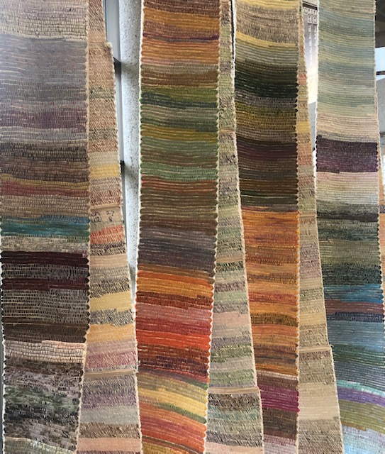 Judy Martin. Канада. "Когда мы проживаем свою жизнь, это что-то вроде гонки: наши умы начинают беспокоиться и затуманиваться, мы впадаем в депрессию и вынуждены уехать в отпуск." — Почему-то хочется сказать про этот половик :"Лента Мира". Материал взят из коллекции тканей Джуди, разорван на полоски и пришиты на холст художника. Начало проекта. "Эту поделку я вышиваю каждый день. Я использую один полный моток ниток для вышивания и лоскутки ткани, которые нахожу в корзине." По словам автора, для нее этот проект -- "эмоциональная" терапия в нелегкие дни, когда ухаживала за тяжелобольным отцом. Вопрос: Откуда вы черпаете вдохновение для работы?
