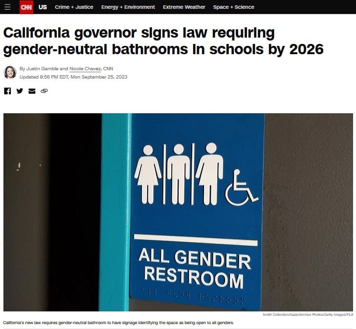 🇺🇸#USA Школы Калифорнии должны обеспечить гендерно-нейтральные туалеты к 2026 году⚠️☝️ 💬 Губернатор Калифорнии Гэвин Ньюсом подписал закон, обязывающий школы обеспечить гендерно-нейтральные туалеты к 2026 году. Новый закон был среди направленных на расширение защиты прав ЛГБТ-сообщества штата.