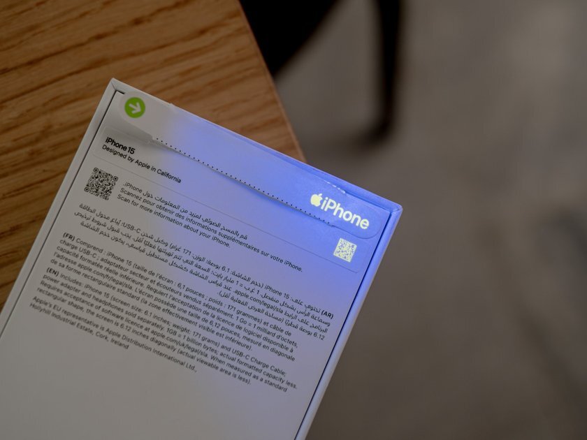 Любую коробку от iPhone 15 можно проверить на оригинальность при помощи ультрафиолетового фонарика. Скрытая надпись «iPhone» и QR-код проявляются на отрывных стикерах упаковки.Пусть вас не смущает ужасная печать на лицевой стороне коробки — внутри лежит оригинальный Айфон 15. Просто мать-природа приказала экономить на чернилах для принтера.В коробке теперь лежит плетеный кабель с USB-C с обоих концов. В связи с этим есть как хорошие, так и плохие новости. О них позже.