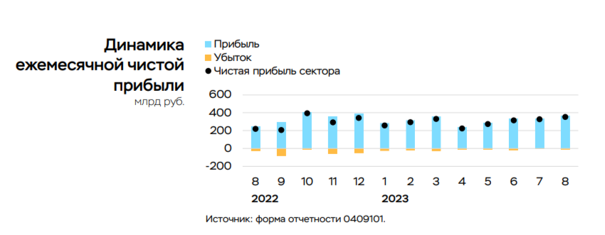 💳 По данным ЦБ, в августе прибыль банков составила 353₽ млрд (ROE — 32% в годовом выражении), это на 8% выше, чем месяцем ранее — 327₽ млрд. С начала года банковский сектор заработал — 2,4₽ трлн (с учётом 2022 года, можно смело утверждать, что банковский сектор оправился от того удара и генерирует кэш на своих счетах, причём высокими темпами). Интересные моменты из отчёта: