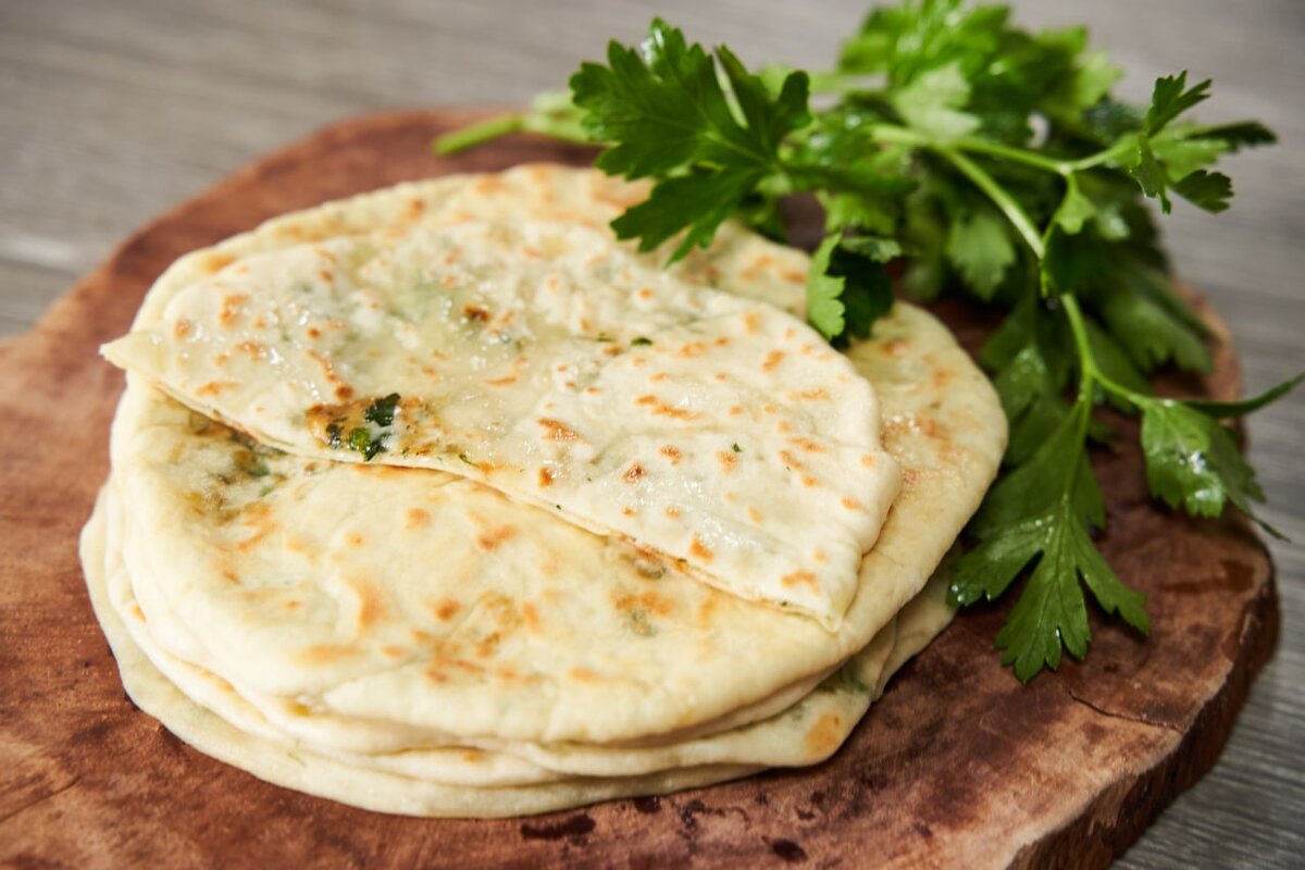 Ингредиенты Кефир 2,5 % 150 мл Сахар 1 ч. ложка Сода 1/3 ч. ложки Мука 260 г Российский сыр 200 г Петрушка 15 г Укроп 15 г Сливочное масло 30 г Соль Приготовление 1. В миске смешать кефир, щепотку соли, сахар и соду. Добавить муку (230 г) и замешать тесто до однородности. Переложить тесто в пакет и отложить в сторону, чтобы набухла клейковина. 2. Сыр натереть на крупной тёрке, а укроп и петрушку мелко нарезать. Перемешать сыр с зеленью. 3. На стол насыпать подпыл (30 г) скатать тесто в колбасу и разрезать на 6 равных частей. 4. Раскатать каждый комочек теста в тонкий блинчик, положить в середину начинку. Защипать тесто в центре оставляя дырочку, а затем раскатать скалкой в лепёшку. Таким образом, сделать ещё 5 штук. 5. На сухую разогретую сковороду отправить лепёшку дырочкой вниз и обжарить до золотистого цвета, затем перевернуть на вторую сторону и по необходимости протыкать ножом, чтобы лепёшка не вздувалась. Таким образом, обжарить ещё 5 лепёшек и смазать каждую сливочн