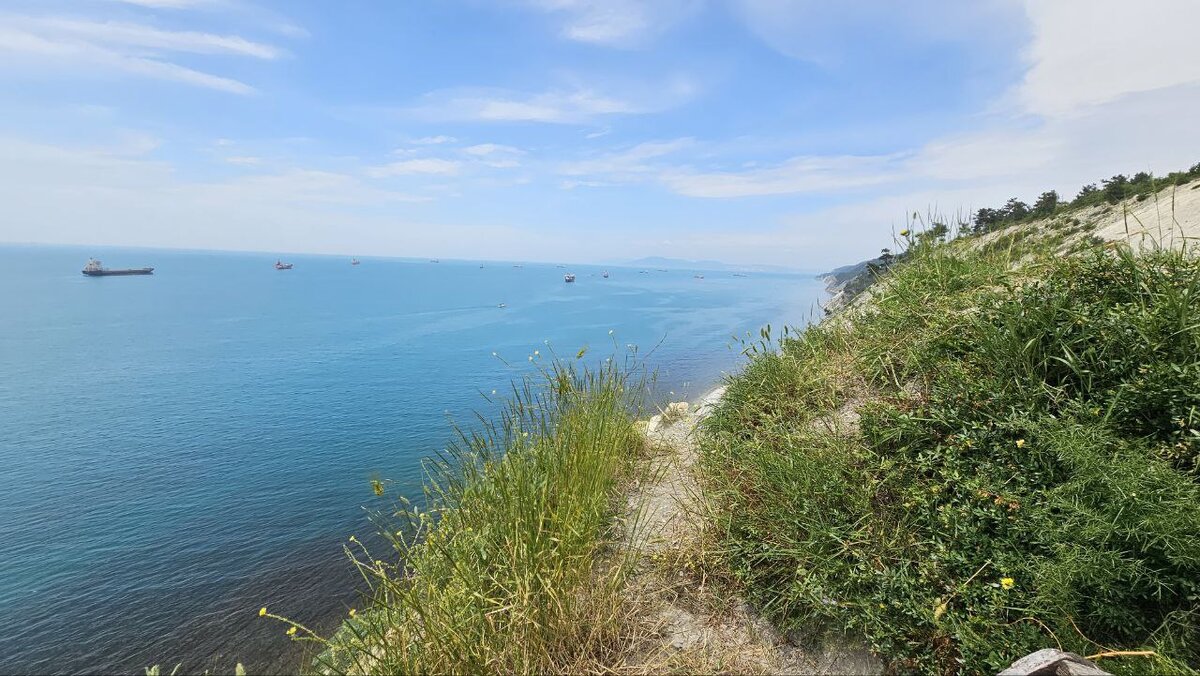 В это красивейшее место в Голубой бухте мы попали только со второго раза. В первый раз погода нас не пустила дальше территории парк-отеля «Берег Роз». Дул сильный ветер, накрапывал дождь, а сырые камни на скалах при порывах ветра, это небезопасное сочетание. Мы походили по территории отеля, удивились ценам на проживание при таком удалении от центра и уехали. И вот, наконец-то, прекрасный солнечный день, на море штиль, быстро собираемся и едем на этот, пока неисследованный нами, Берег Роз. Дорога на Голубую бухту, потом через мостик налево и дальше по грунтовке до упора. Не доезжая отеля, паркуем машину в одном из многочисленных «карманов» между деревьями, дальше идем пешком по тропинке вдоль забора в сторону моря. Эффектных мест на побережье мы видели много и, кажется, что удивить нас трудно, но картина, которая открывается перед нами просто поражает. Представьте край обрыва, высота метров пятьдесят и абсолютно гладкий, как стекло, почти вертикальный склон. Вниз лучше не смотреть, гол