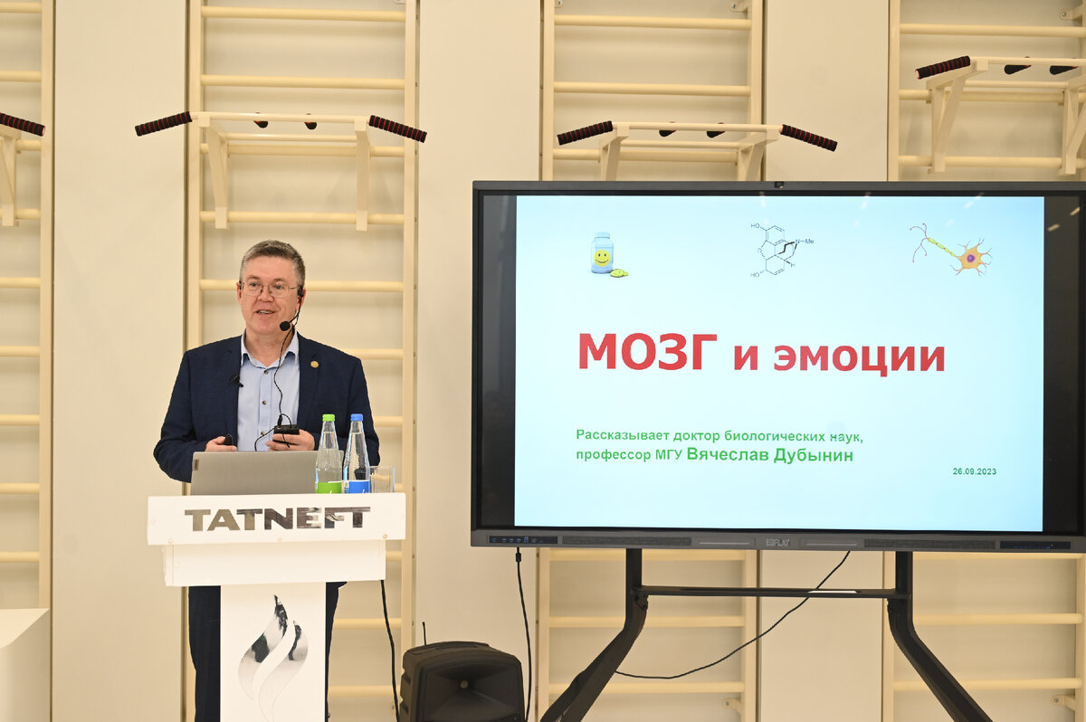 Сегодня сотрудники Компании и студенты ВШН послушали лекцию Вячеслава Дубынина — профессора кафедры физиологии человека и животных биологического факультета МГУ. Вячеслав Альбертович не только доктор наук и автор более 100 работ. Еще он пишет книги-бестселлеры о физиологии, нейробиологии и психофармакологии и является одним из самых известных в России популяризаторов науки. В. Дубынин приехал в Альметьевск и поучаствовал в работе круглого стола о системе непрерывного развития личности. Кроме этого он посетил детский сад, новый лицей №1, Кампус ВШН и школьные биолаборатории, открытые под эгидой «Татнефти».