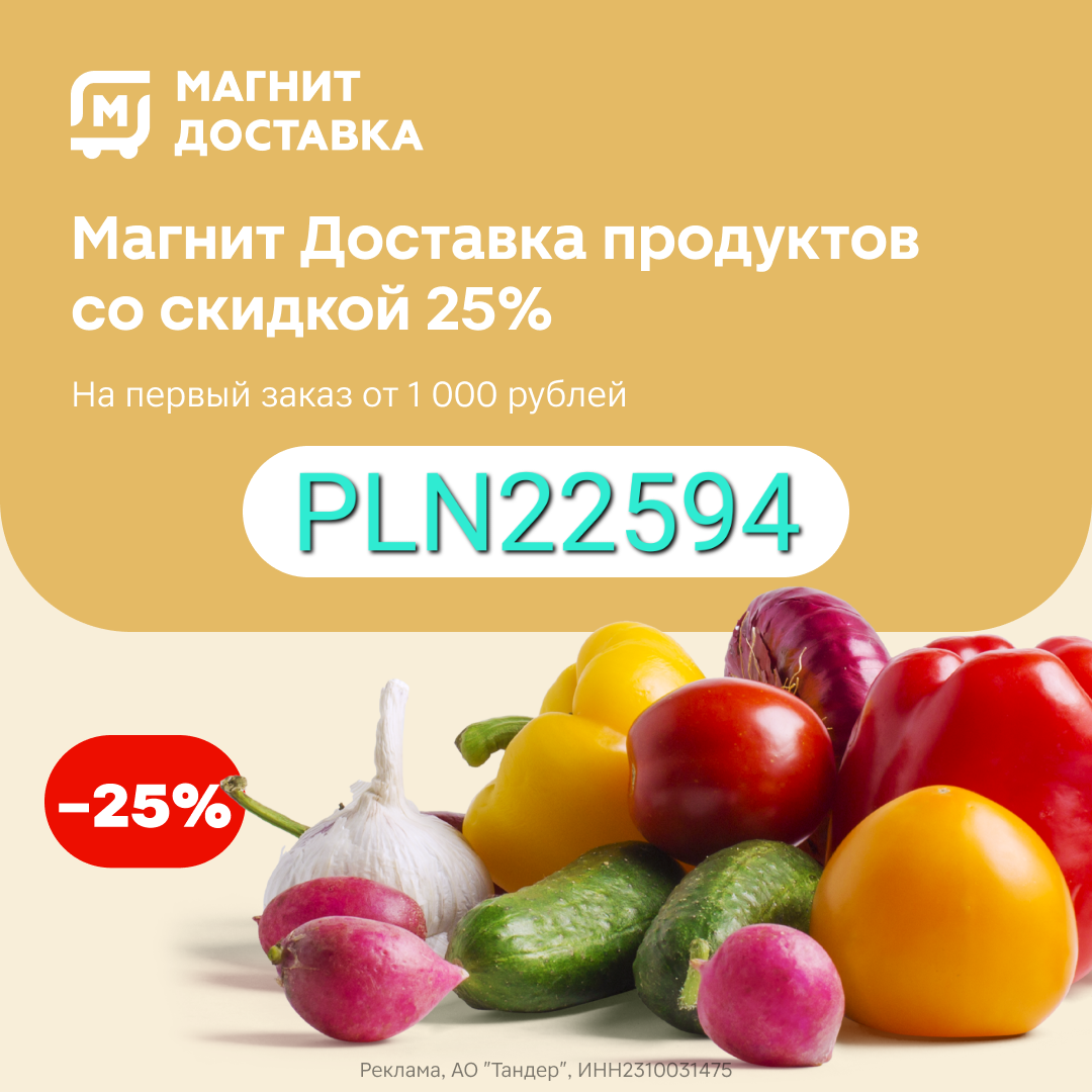Erid:LdtCK1Acw 💥Магнит Доставка – это выбор из широкого ассортимента товаров высокого качества по доступным ценам. 💥Среди продуктов собственного бренда “Наша марка” можно найти все от свежих овощей и зелени до кондитерской продукции, макаронных и мучных изделий, полуфабрикатов, сухих завтраков и других товаров. ✅️Активация промокода PLN22594 подарит вам скидку 25%* на первый заказ от 1000 рублей в приложении или на сайте! Активировать промокод можно тут ✅️Скидка не распространяется на сахар и не суммируется со скидками.* Реклама, АО "Тандер", ИНН2310031475"