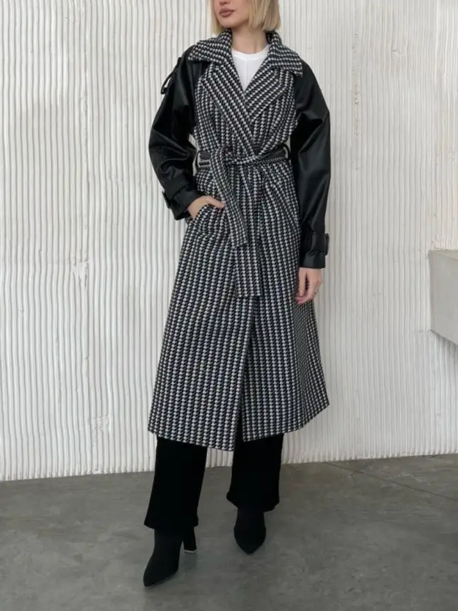- Черно-белый узор «куриная лапка»– контрастный, он моментально бросается в глаза. При этом выглядит пальто с таким рисунком чрезвычайно элегантно и стильно.