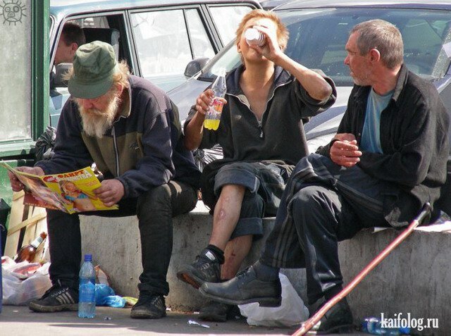 Недавно была в одном сетевом магазине, нагрузившись сумками, устав от переполненных касс, и смрадящих прилавков с мясом, вышла на задний выход покурить. Достала сигарету, циркнула зажигалкой, и присела на ступеньку, вытянула уставшие ноги из туфель. Наблюдаю такую картину: На заднем входе - огромные железные ворота, открыты между-прочим и днём и ночью, возле которых восседала царствующая мусорная гора, с кучей просроченных продуктов, вещей и всякого разного хлама. Рядом с помойкой суетились трое бомжей, изрядно выпивших, раскрасневшихся от грядущей добычи. Двое молодых мужчин и одна женщина, на вид 40-45 лет. Она, как положено женщине, стояла подбоченив руки в бока, истошно вопила. -" не трогай красную шапочку, своими грязными ручищами! Я в ней ходить буду!" Товарищ, какой крепко вцепился в предмет спора, упорно тянул её к себе, и явно делиться добычей не хотел. Одной рукой он намертво держал помпон, а второй пытался оторвать пучок, на голове вопившей дамы. Третий товарищ, не выдержа