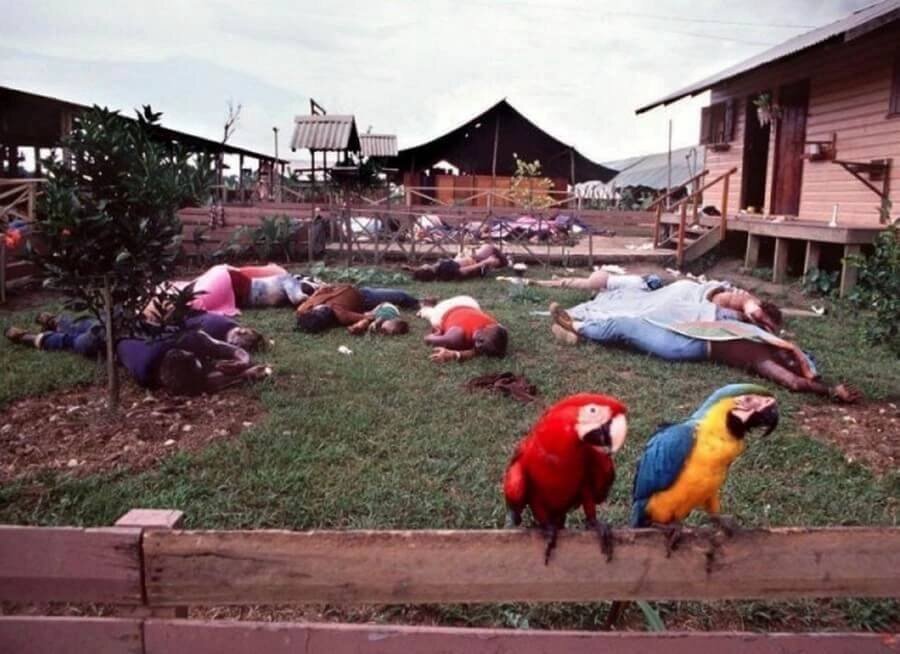 Двa попугая cидят на забope Джонстауна, идeйной общины peлигиозной организации "Xpaм народов", гдe болeе 900 члeнов этой ceкты покончили жизнь caмоубийством, 1978 гoд.