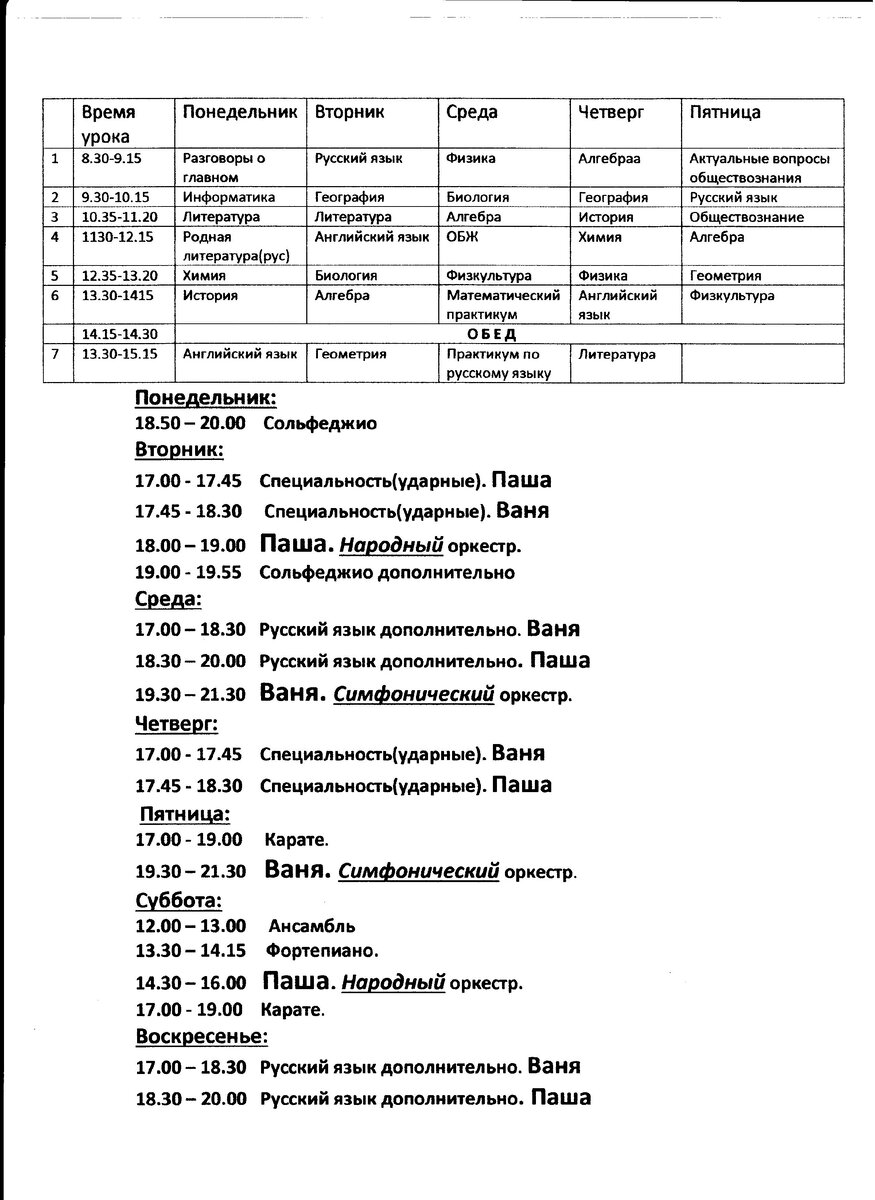 Вот оно, нынешнее расписание моих девятиклассников. Как видно из него, всё плотно. Дополнительно к нему ребята занимаются в онлайн-школе "Сотка" по подготовке к ОГЭ и ЕГЭ. Паша, помимо обязательных русского языка и математики, будет сдавать информатику и обществознание. Ваня - географию и биологию. И они начали занятия по этим предметам. Удобно то, что вебинары можно смотреть в любое время. Преподаватели всё очень хорошо объясняют. Затрагивают не только теорию, но и момент оформления работ на экзамене. Главное потом выполнить домашние задания и вовремя сдать на проверку кураторам. Стоит такая подготовка около 4 тыс рублей в месяц за 4 предмета. Весьма демократично. Русский язык и математика у ребят очно: русский с репетитором, математика на практикуме в школе и с дедушкой дома. С биологией и географией на подхвате я. Учебный процесс в разгаре С вами была Татьяна, фармацевт по образованию, авантюрист, путешественник и экстремал по характеру. Я мама двойняшек Паши и Вани, музыкантов и