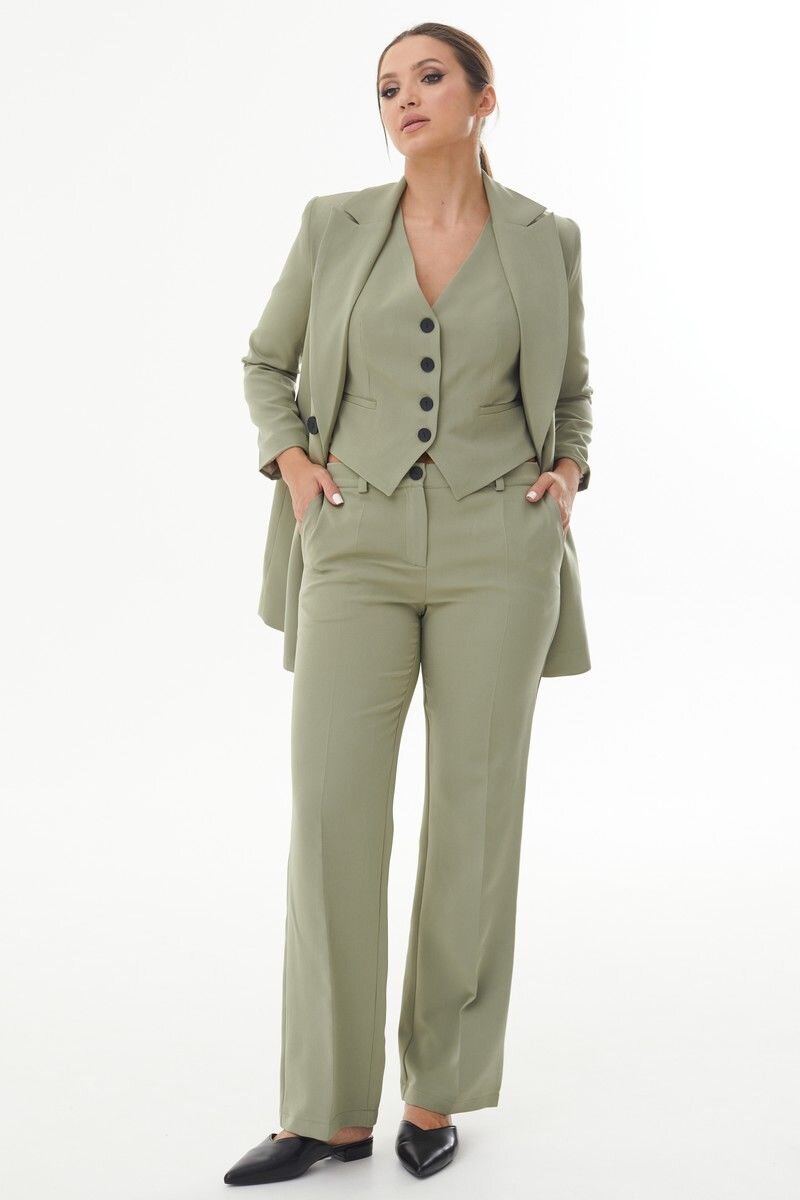- Начнём с нестареющей классики – брючный костюм «тройка». В примере это модель оливкового цвета, состоящая из прямых брюк, жилета и пиджака. Этот костюм самодостаточный, его можно носить без дополнительных элементов, надевая жилет первым слоем одежды. Кроме того, на базе этого костюма можно создать массу новых образов. Например, надеть брюки с джемпером или жилет с рубашкой и юбкой. Вариантов комбинаций – множество, их невозможно перечислить.