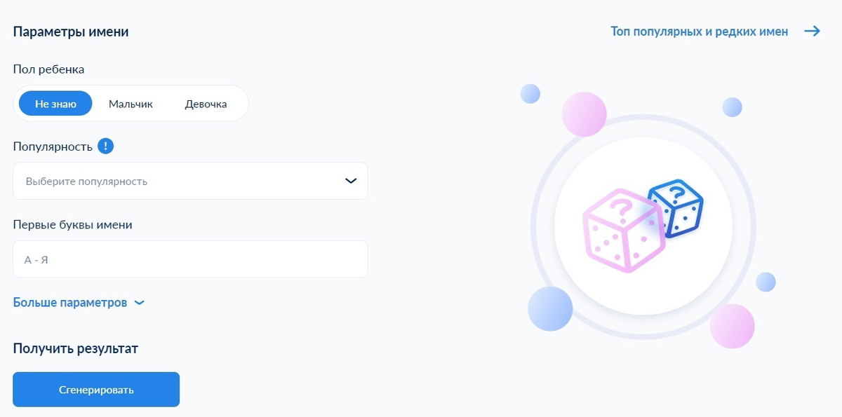Во-вторых, можно сгенерировать случайное имя для ребенка. Пройдя по кнопке «Сгенерировать» необходимо заполнить форму, в которой указать пол ребенка, имя по популярности или редкости, первую букву имени, его длину – короткое или длинное, отчество. Также необходимо выбрать регион.