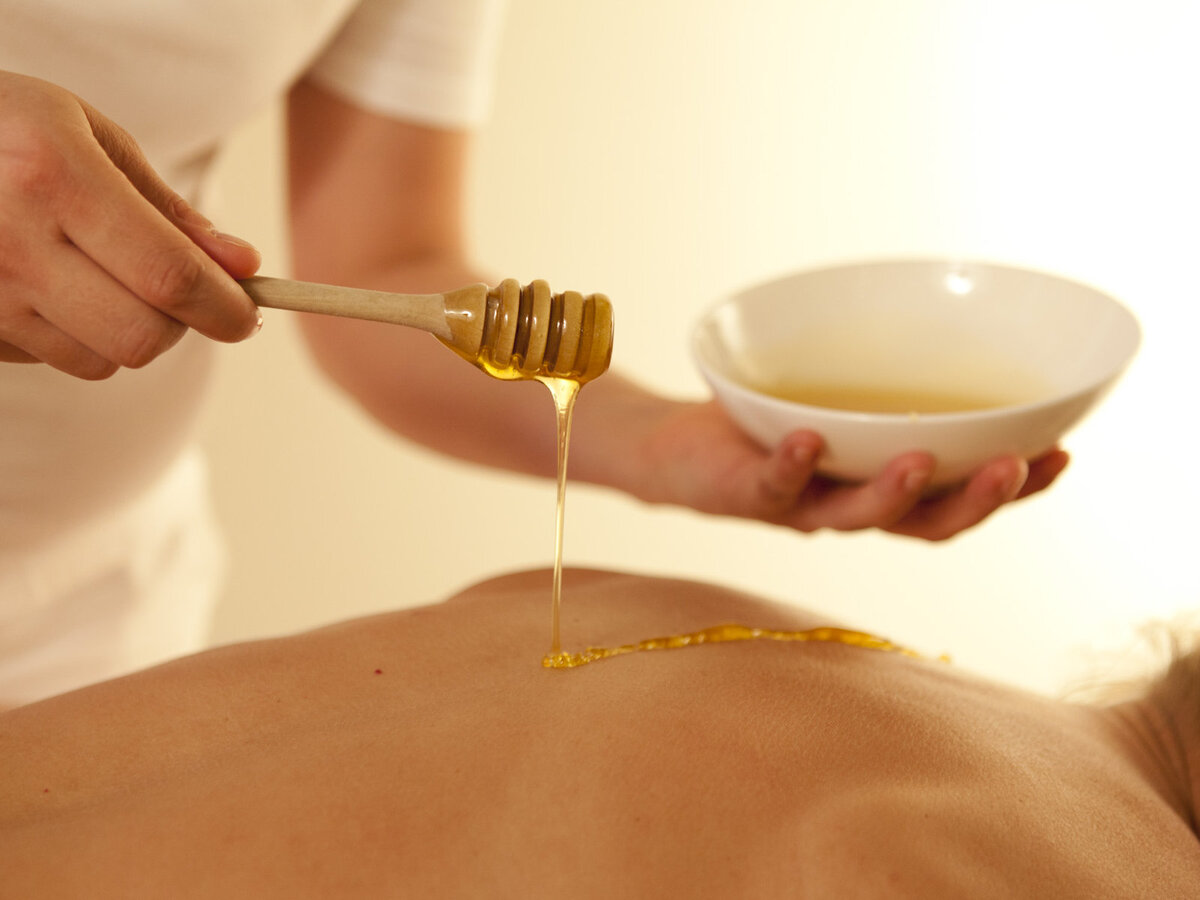 Медовый массаж основан на взаимодействии кожи и биологически активных веществ, содержащихся в меде, включает стандартные механизмы воздействия разных видов массажа, показан для ухода за кожей. При медовом массаже улучшается кровообращение в глубоких слоях кожи и подлежащих мышцах, что способствует улучшению питания внутренних органов и тканей. Мед, отдавая биологически активные вещества, адсорбирует токсины и способ ствует быстрому выведению их из организма. Такой массаж прово дится для увеличения лимфооттока и чистки кожи. После его про- ведения кожа разглаживается, становится шелковистой и упругой. Курс медового массажа рассчитан на 15 сеансов, проводимых через день. Мед с маслами смешивается непосредственно перед массажем. Если используются несколько масел, то сначала смешиваются масла, затем добавляется мед и все тщательно перемешивается. Для проведения медового массажа мед наносится на ладони и похлопывающими движениями переносится на массируемую зону. Если таких зон несколько -