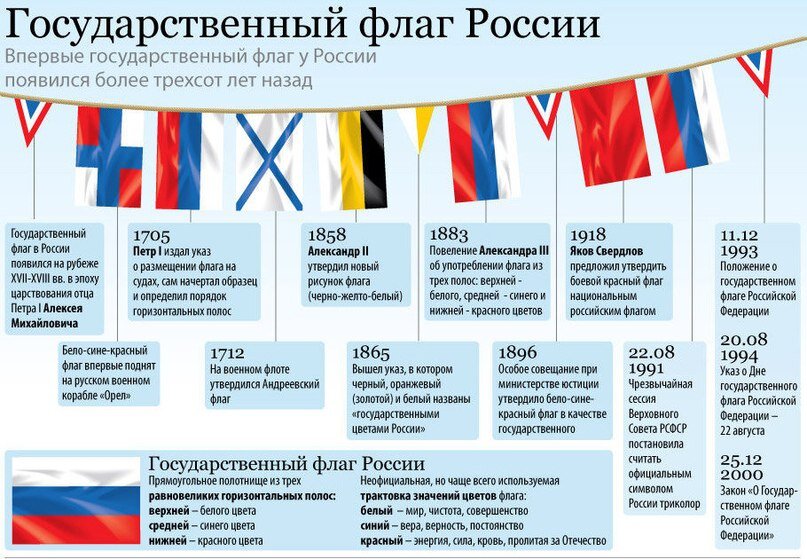 2 августа 1991 года над Белым домом в Москве впервые был официально поднят трехцветный российский флаг, заменивший в качестве государственного символа красное полотнище с серпом и молотом. История Государственный флаг в России появился на рубеже XVII-XVIII веков, в эпоху становления России как мощного государства. Впервые бело-сине-красный флаг был поднят на первом русском военном корабле «Орел», в царствование отца Петра I Алексея Михайловича. «Орел» недолго плавал под новым знаменем: спустившись по Волге до Астрахани, был там сожжен восставшими крестьянами Степана Разина. Законным отцом триколора признан Петр I. 20 января 1705 года он издал указ, согласно которому «на торговых всяких судах» должны поднимать бело-сине-красный флаг, сам начертал образец и определил порядок горизонтальных полос. В разных вариациях трехполосный флаг украшал и военные корабли до 1712 года, когда на военном флоте утвердился Андреевский флаг. В 1858 году Александр II