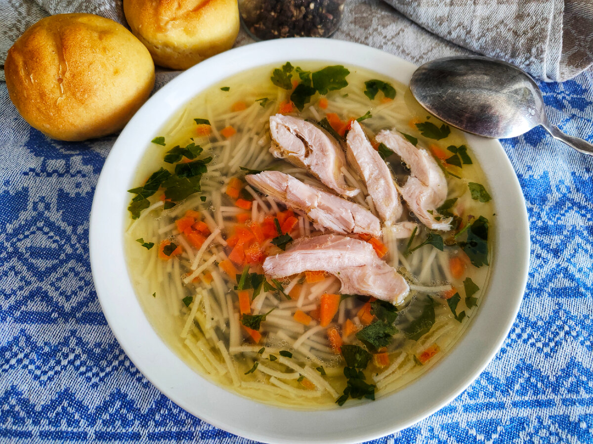 А почему бы и не рассказать, как я варю самый простой суп - куриный с вермишелью? - курица суповая примерно 1 кг - лук 1 шт. - морковь 1 шт. - вермишель 100 г - соль 1 ч.ложка Зелень петрушки и молотый перец при подаче, по вкусу. Курочку хорошо промываем изнутри и снаружи горячей, а потом холодной водой. Помещаем в кастрюлю, наливаем 2 л воды: Доводим до кипения: ☝️Я варю супы на второй воде, поэтому даю покипеть минут пять и сливаю. Затем промываю курицу и кастрюлю, вновь заливаю чистой водой и даю закипеть. Все эти манипуляции делаются для того, чтобы удалить всё вредное, чем, теоретически, может быть обработана курица, и чтобы частично снизить жирность. Если вы против такого способа, то снимайте просто пенку и продолжайте варить. После повторного закипания, кладём в кастрюлю целую очищенную луковицу и половинку крупно порезанной морковки. Если есть корень петрушки или сельдерея, то добавьте и его. Солим бульон. Огонь убавляем до самого слабого кипения с приоткрытой крышкой и варим