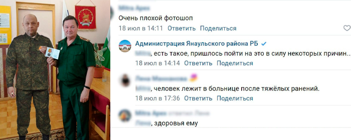 При этом сам награжденный в это время был на лечении с серьезным ранением и недавно умер. Чиновники из Янаульского района Башкирии прибегли к программе Adobe Photoshop, чтобы создать монтажное изображение военного, которому была присуждена медаль за участие в специальной военной операции (СВО), хотя в тот момент боец находился в тяжелом состоянии в больнице и два дня назад скончался. В июле они опубликовали в своем официальном паблике информацию о награждении Артура Султангалиева, где утверждали, что медаль за участие в СВО вручил ему сам военный комиссар города Янаула. Однако на фотографии было видно не самого Султангалиева, а его плохо вырезанное изображение из другого фото. Пользователи социальных сетей были удивлены такой необычной «обработкой» фотографии. В ответ на критику чиновники признались, что им пришлось использовать фотошоп, а также «пришлось пойти на это в силу некоторых причин». Потом выяснилось, что, участник СВО всё же сам приходил на награждение — но в шлёпках и шорта