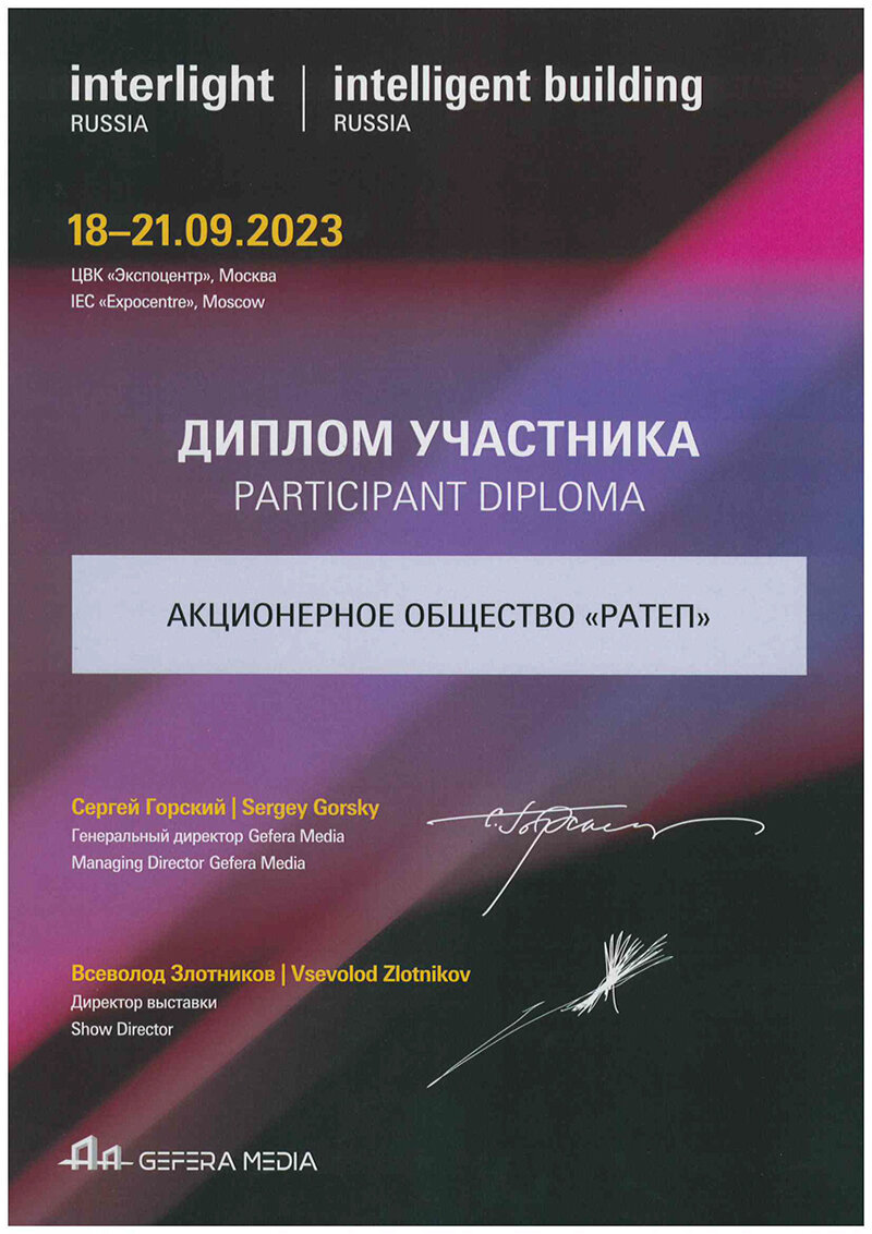 С 18 по 21 сентября 2023 года АО «РАТЕП», входящее в Концерн ВКО «Алмаз – Антей», приняло участие в Международной выставке освещения, электротехники, автоматизации зданий и систем безопасности INTERLIGHT RUSSIA | INTELLIGENT BUILDING RUSSIA, проходившей в московском Экспоцентре. В 2018 году в рамках программы диверсификации РАТЕП совместно с Концерном ВКО «Алмаз – Антей» начал реализацию проекта по разработке светодиодных светильников. Было освоено серийное производство. Сегодня продукция предприятия достигла высоких темпов изготовления и приобрела известность на рынке отечественного освещения, а ассортимент линейки достиг 10000 наименований, в числе которого светильники для уличного, промышленного, административно-офисного, складского, дорожного, жилищно-коммунального и аграрного освещения. На выставке РАТЕП продемонстрировал весь спектр производимого светодиодного оборудования. Данное мероприятие — лидирующий международный проект, объединяющий профессионалов в области освещения, авто