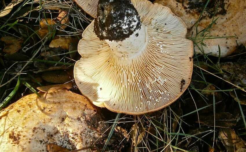 - Окраска и мякоть. Настоящий белый груздь имеет такую же светлую мякоть, рыжеющую при повреждении. Ложный может розоветь или буреть. Мякоть черного груздя темно-оливковая, при срезе становится серой.