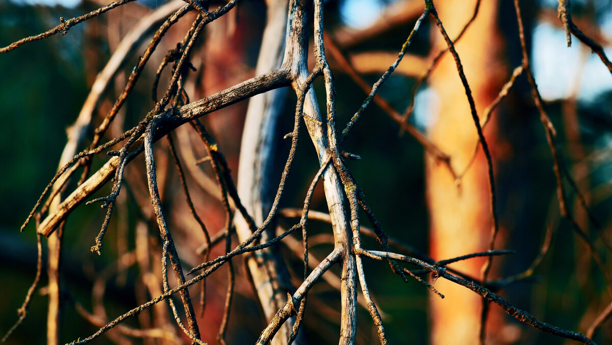Умершие сосновые веточки, без коры и слабо покрытые мхом, красиво блестят на солнце в предзакатный час.