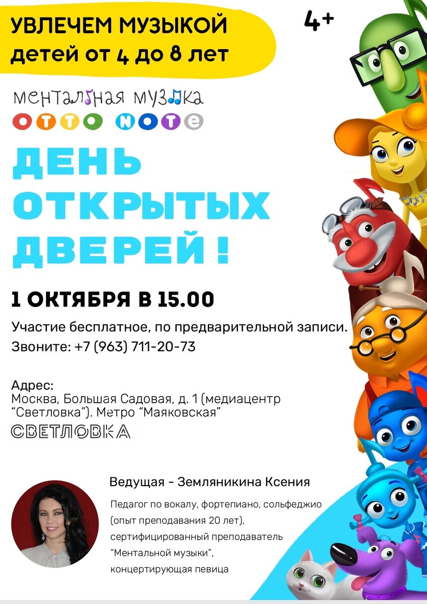 1 октября 2023 года! 🔤🔤🔤🔤🔤🔤🔤🔤🔤🔤 Дорогие друзья! Продюсерский Центр "XENIA MUSIC production" при поддержке Союза деятелей музыки, кино и телевидения #сдмкт приглашает детей и их родителей на День Открытых Дверей в школу музыки "XENIA MUSIC Kids"!🥰🥰🥰 В этот замечательный день музыки, 1️⃣октября 2023 года в 15.00, мы приглашаем всех желающих на праздничный концерт, а также на первое бесплатное занятие по инновационной программе развития музыкальных способностей ребёнка "Ментальная музыка OTTO NOTE". 🎵 Доверьте Вашим детям возможность раскрыть свои музыкальные таланты и насладиться процессом обучения в дружеской и вдохновляющей атмосфере. Наш опытный и сертифицированный преподаватель Земляникина Ксения Юрьевна (артист XENIA , певица, педагог по вокалу, фортепиано, хору) поможет развить музыкальные навыки детей и открыть для них волшебный мир музыки.🎵 Место проведения мероприятия: г. Москва, Большая Садовая ул, 1, Метро Маяковская Медиацентр "СВЕТЛОВКА" (Центральн