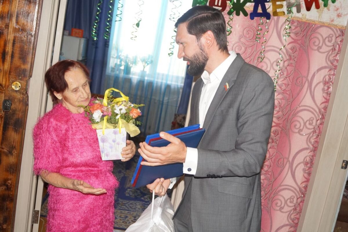 Именинница приняла поздравления и памятный подарок от депутата Совета депутатов МО Оренбургский район Александра Матюхина и от главы Первомайского поссовета Олега Куличенко.