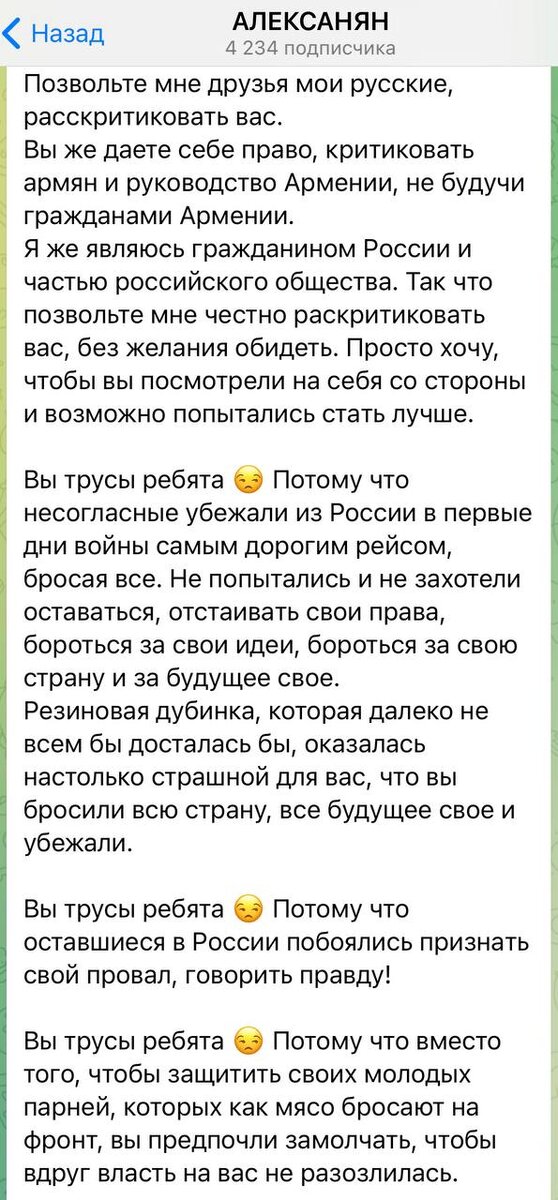 "Я чхасть руске культура" - так начал своё феноменальное обращение гражданин России армянского происхождения Александр Фирдусович Алексанян. Мы, конечно же, полностью прочитали его высокоинтеллектуальный труд о том, почему русские трусы и поэтому вкратце перескажем всё вам, чтобы вы, наши дорогие читатели, не трепали себе нервы очередным русофобом. Но позвольте сначала обратиться с небольшой просьбой к Фирдусовичу: сделайте, пожалуйста, теперь шаверму в сырном лаваше… В своём заявлении нежеланный гость России написал аж 12 тезисов о том, почему русские трусы. Самыми "культовыми" стали заявления о том, что наш народ в целом-то и не поддерживает СВО, да и Владимира Владимировича никто вообще не уважает. Кажется, что такие глупые заявления даже на Украине не делали, ведь господство Путина признано даже мировым политическим сообществом.